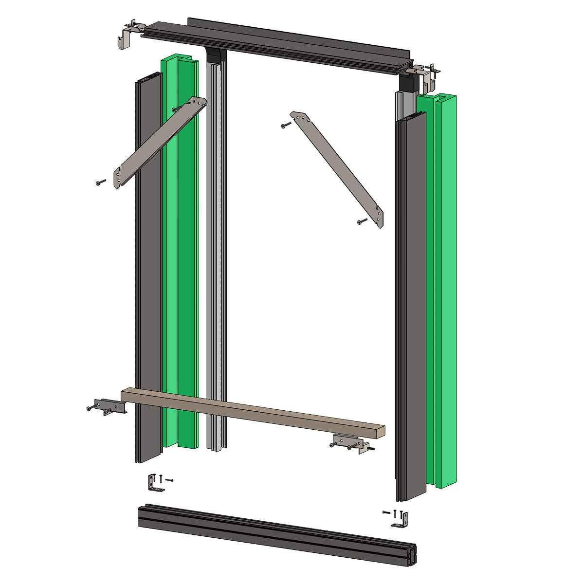 Il kit è realizzato con profili in PVC a bassissima conducibilità termica, forniti in barre e accoppiabili tra loro con semplici operazioni di aggancio, incollaggio o avvitatura. Nel controtelaio (uguale sui 3 lati), un profilo funge da battuta frontale ed un altro da telaio di varie dimensioni, eventualmente da rifilare. Il kit comprende i rinforzi interni in legno (da 9 x 29 mm forniti a parte) e l’assemblaggio si realizza tramite semplici squadrette. I distanziali in legno, dimensionabili in lunghezza, sono predisposti per l’impiego con i supporti di collegamento in acciaio.